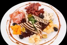 240 г • Полендвица, бастурма, тостовый хлеб, сыр твердый, с плесенью, чеддер, моцарелла, вяленые томаты, оливки, маслины, рукола