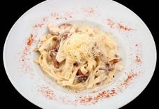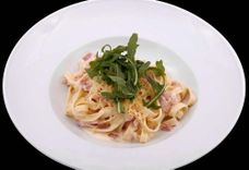 300/5 г • Домашняя лапша, сливки, грудинка копченая, яйца, сыр, чеснок, руккола