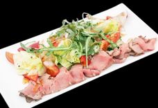 205 г • Вырезка говяжья, масло оливковое, соевый соус, уксус бальзамический, руккола, сыр пармезан, лимон