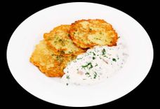 240/50 г • Картофельные оладьи фаршированные свининой, подаются со сметаной