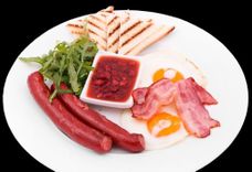 330 г • Тостовый хлеб, колбаски охотничьи, бекон, яйца, фасоль консервированная, руккола