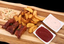 150/300 г • Запеченные свиные ребрышки в глазури из томатной пасты, соуса Чили, соуса Терияки и чеснока.Подается с картофельными дольками, соусом барбекю,чесночным и салатом Коул слоу