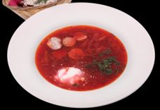300/60/1 г • Колбаса домашняя, свекла, картофель, капуста, морковь, перец, чеснок, хлеб ржаной, шпик закусочный, сметана, зелень
