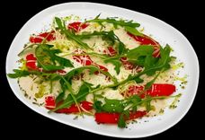 180 г • Перец сладкий печеный,соус из тунца,рукола,сыр пармезан,заправка "Свежая зелень"