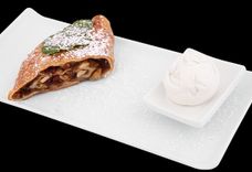 150/50 г • Рулет из слоеного теста с яблоками,вяленой клюквой,корицей,грецким орехом. Подается с шариком мороженого