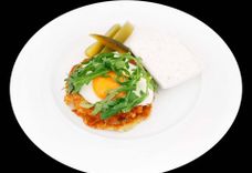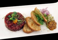180/1 г • Вырезка говяжья, перепелиное яйцо, масло оливковое, соевый соус, крутоны, маринованный огурец, лук, французская горчица, каперсы, зелень