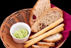 130/20 г • Хлеб Чиабатта Европейская, хлеб Мультизлаковый, хлебные палочки Гриссини с кунжутом, сливочное масло с зеленью