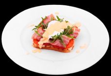 250 г • Тостовый хлеб, бекон, сыр творожный, яйцо пашот, томаты, соус голландский, руккола