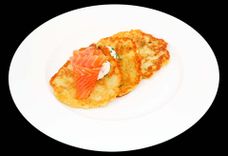 240 г • Драники,творожный сыр с маринованным огурчиком и укропом,форель сл/сол.