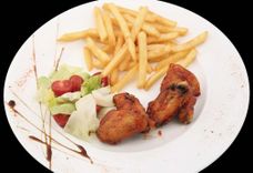 150/150/1 г • Крылышки куриные, сладкий соус Чили, картофель фри, зелень