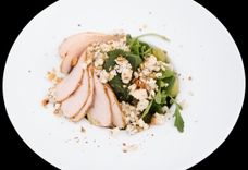 200 г • Филе куриное, кабачки, перец, листья салата, заправка свежая зелень, лук-порей, грецкие орехи