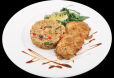 150/150/100/3 г • Медальоны из филе индейки, маринованные в соке лимона и специях, подаются с сливочно-манговым соусом и паровым рисом Басмати