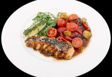 120/160 г • Запеченный лосось с соусом терияки, цукини, свежим перцем, томатами черри,соусом сладкий Чили, лимоном и зеленью